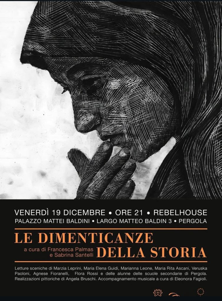 Seguiranno letture sceniche di racconti e poesie, tra le lettrici anche le ragazze delle Scuole secondarie di Pergola, IC Binotti e Liceo Torelli di Pergola. Alla parola poetica saranno associati gli interventi musicali interpretati da Eleonora Fagioli, accompagnati dalle suggestive immagini create dall’artista Angela Bruschi. Per la locandina si ringrazia la generosità di Simone Massi.